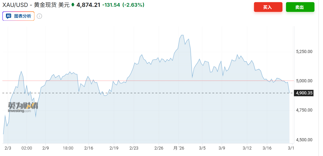 欧盘交易时段,现货黄金跌破4900美元/盎司,续创2月18日以来新低,日内跌幅2.6%;现货白银回落至77美元/盎司下方,日内跌2.2%。现货钯金跌逾3%,至每盎司1,550.64美元。