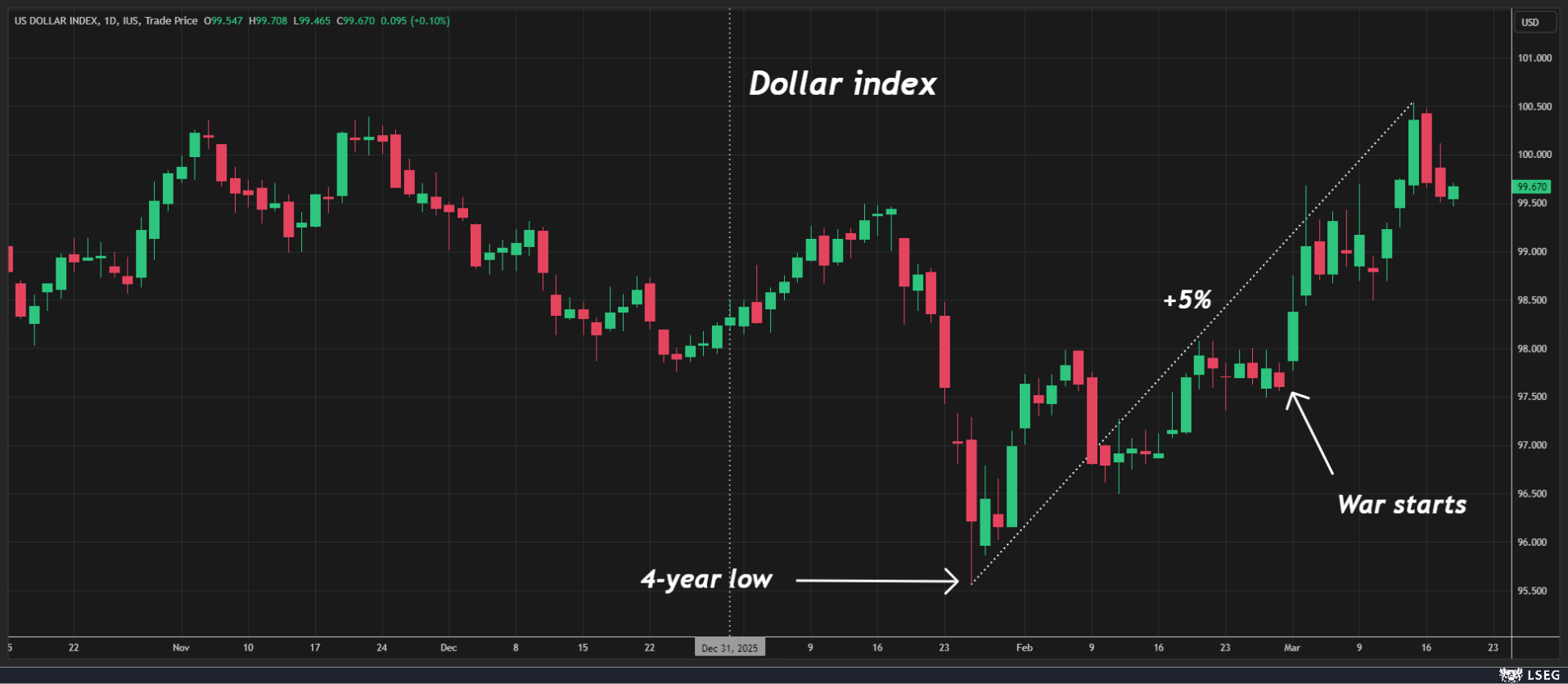 行情数据显示,自从2月28日美国与以色列对伊朗的打击引发全地区冲突,并几乎掐断了全球近五分之一石油供应咽喉的霍尔木兹海峡以来,美元已成为最明确的“避险”赢家之一。