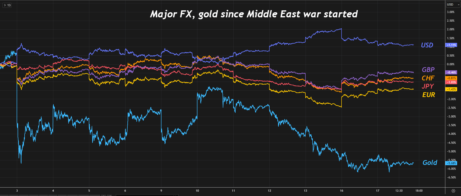 美元的表现已经盖过了包括瑞郎和日元在内的所有其他避险货币,并以相当大的优势领先于国债和黄金等其他传统避险资产。突然之间,2026年看空美元的共识似乎已显得极其过时。