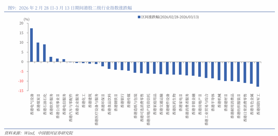 国际资金流出:在冲突激化期间(2月27日至3月13日),代表外资的“国际中介机构”持股市值减少约7000亿港元,显示欧美主动型基金出于避险需求阶段性撤离港股。