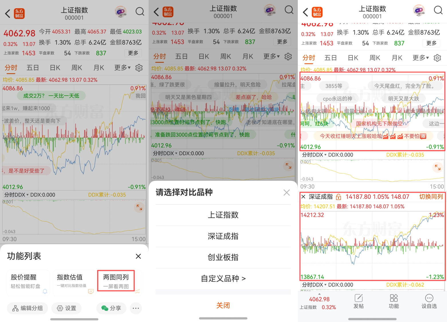 - 个股页面支持一屏展示两幅分时图,方便对比不同品种的走势变化;