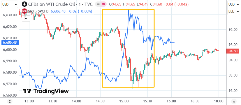 当下,美股走势与国际原油价格高度“负相关”。日内,WTI原油期货价格一度升破每桶100美元关口,但之后持续走低——这也是美股三大指数开始反弹的时机。