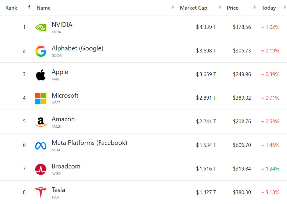 “七巨头”集体下跌,(按市值排列)英伟达跌1.02%,谷歌C跌0.19%,苹果跌0.39%,微软跌0.71%,亚马逊跌0.53%,Meta跌1.46%,特斯拉跌3.18%。