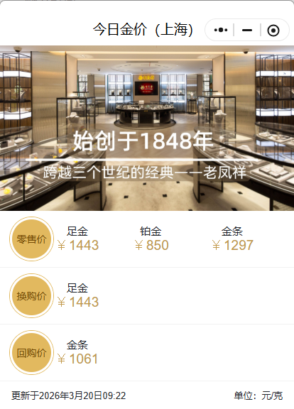老凤祥足金饰品报1443元/克,较前一日1498元/克跌55元,两天跌去97元。