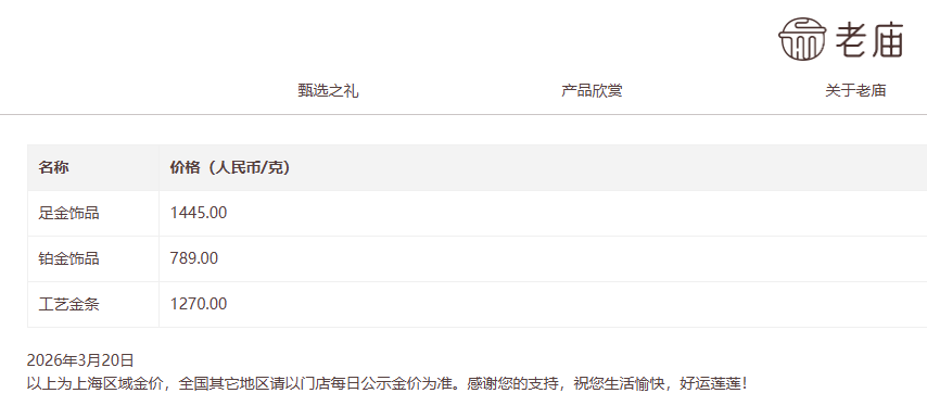 老庙黄金足金饰品报1445元/克,较前一日1498元/克跌53元,两天跌去105元;