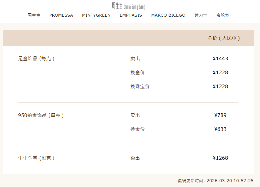 周生生足金饰品报1443元/克,较前一日1492元/克跌49元,两天跌去104元;