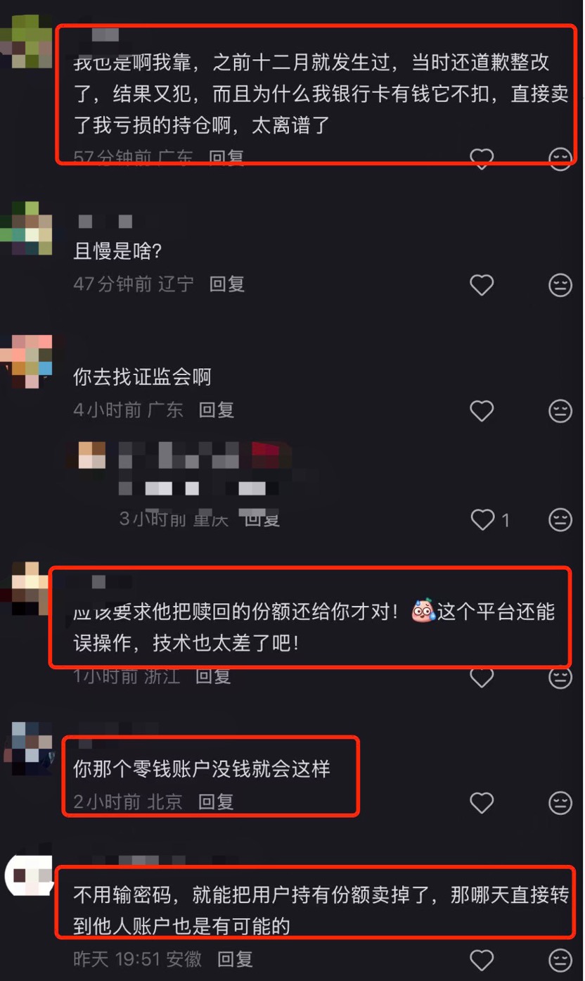 尽管有相应解释,但是多数基民表示不理解。“这误操作,技术也太差了”“不用密码就能把份额卖掉,那直接转到他人账户也有可能”,还有基民表示,之前2025年12月已经发生过一次,不理解为何“银行卡有钱不扣,但是赎回了亏损的持仓基金”。
