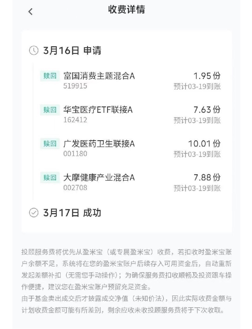 有基民晒出被赎回的产品,在截图中显示,有基民投顾组合中有富国消费主题混合、华宝医疗ETF联接、广发医药卫生联接以及大摩健康产业混合等基金被不同程度赎回,赎回份额在1.95份至10.01份不等。