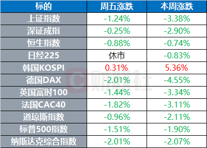 欧洲主要股指收盘普跌,德国DAX指数本周累跌4.55%;法国股指本周累跌3.11%;英国股指本周累跌3.34%。