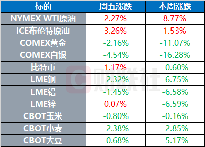 国际金银下跌,现货黄金跌3.43%,报4498.31美元/盎司,本周累计下跌10.37%;COMEX黄金期货跌2.16%,报4505.70美元/盎司,本周累跌11.07%。现货白银跌6.89%,报67.801美元/盎司,本周累计下跌15.85%;COMEX白银期货跌4.54%,报67.980美元/盎司,本周累跌16.28%。