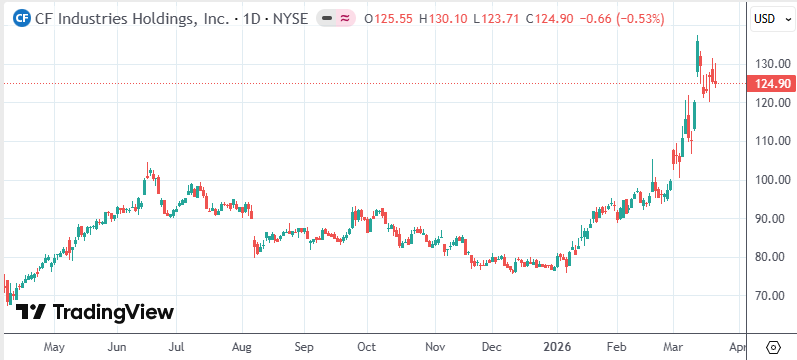 总部位于美国伊利诺伊州的CF Industries成为中东战事中的早期赢家之一。自冲突爆发以来,其股价已累计上涨25%,涨幅在标普500指数成分股中排名第三。