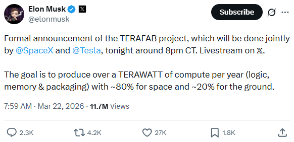 马斯克正式发布Terafab项目:目标年产1太瓦算力 主要于太空部署