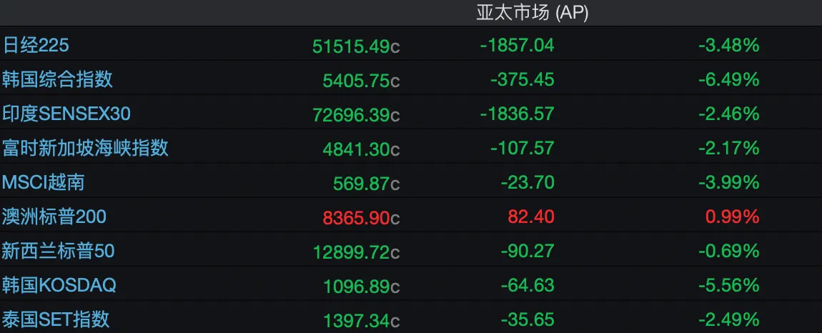 今日亚洲交易时段,各国股市也再度集体跳水。