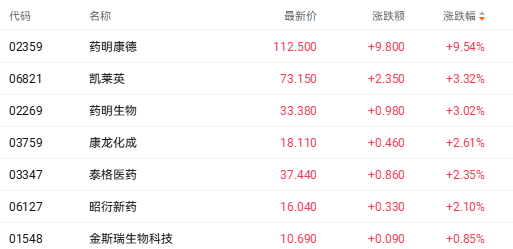 财联社3月24日讯(编辑 胡家荣)港股医药板块迎来显著反弹。截至发稿,药明康德(02359.HK)涨9.54%、凯莱英(06821.HK)涨3.32%、药明生物(02269.HK)涨3.02%、康龙化成(03759.HK)涨2.61%。