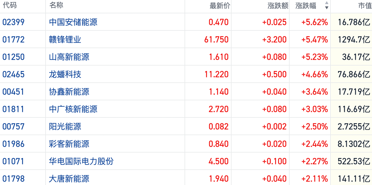 截至发稿,山高新能源(01250.HK)、赣锋锂业(01772.HK)双双涨逾5%,协鑫新能源(00451.HK)等多只个股也跟涨2%以上。
