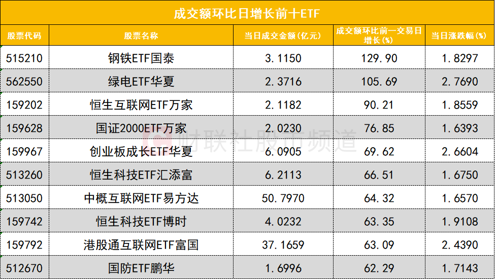 从成交额环比增长前十的ETF来看,钢铁ETF国泰(515210)成交额环比增长129%位居首位;绿电ETF华夏(562550)成交额环比增长105%位居次席。