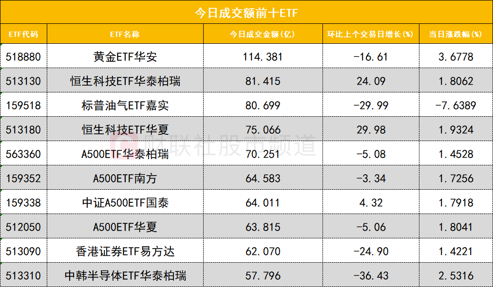 从成交额前十的ETF来看,黄金ETF华安(518880)成交额位居首位,恒生科技ETF华泰柏瑞(513130)成交额位居次席。