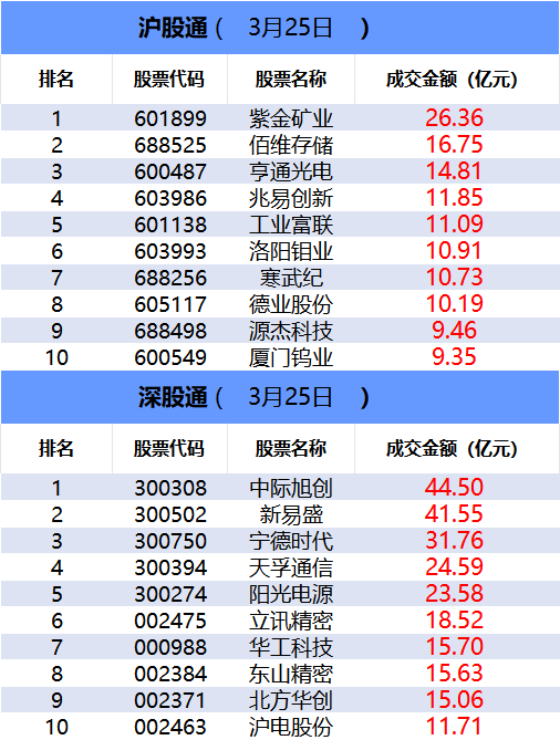从沪股通前十大成交个股来看,紫金矿业位居首位;佰维存储和亨通光电分居二、三位。