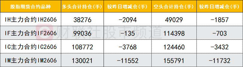 四大期指主力合约中,IH、IF、IC、IM合约多空双方均减仓,IF合约空头减仓数量较多。