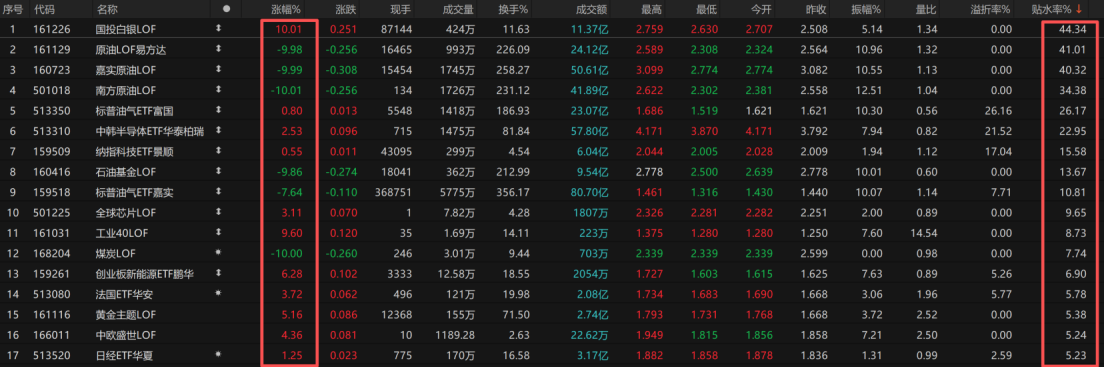 除了标普油气ETF富国,截至今天收盘,溢价高企的还有多只油气LOF,升水率甚至超过40%,不乏产品今天上午至10点半前已经停牌。