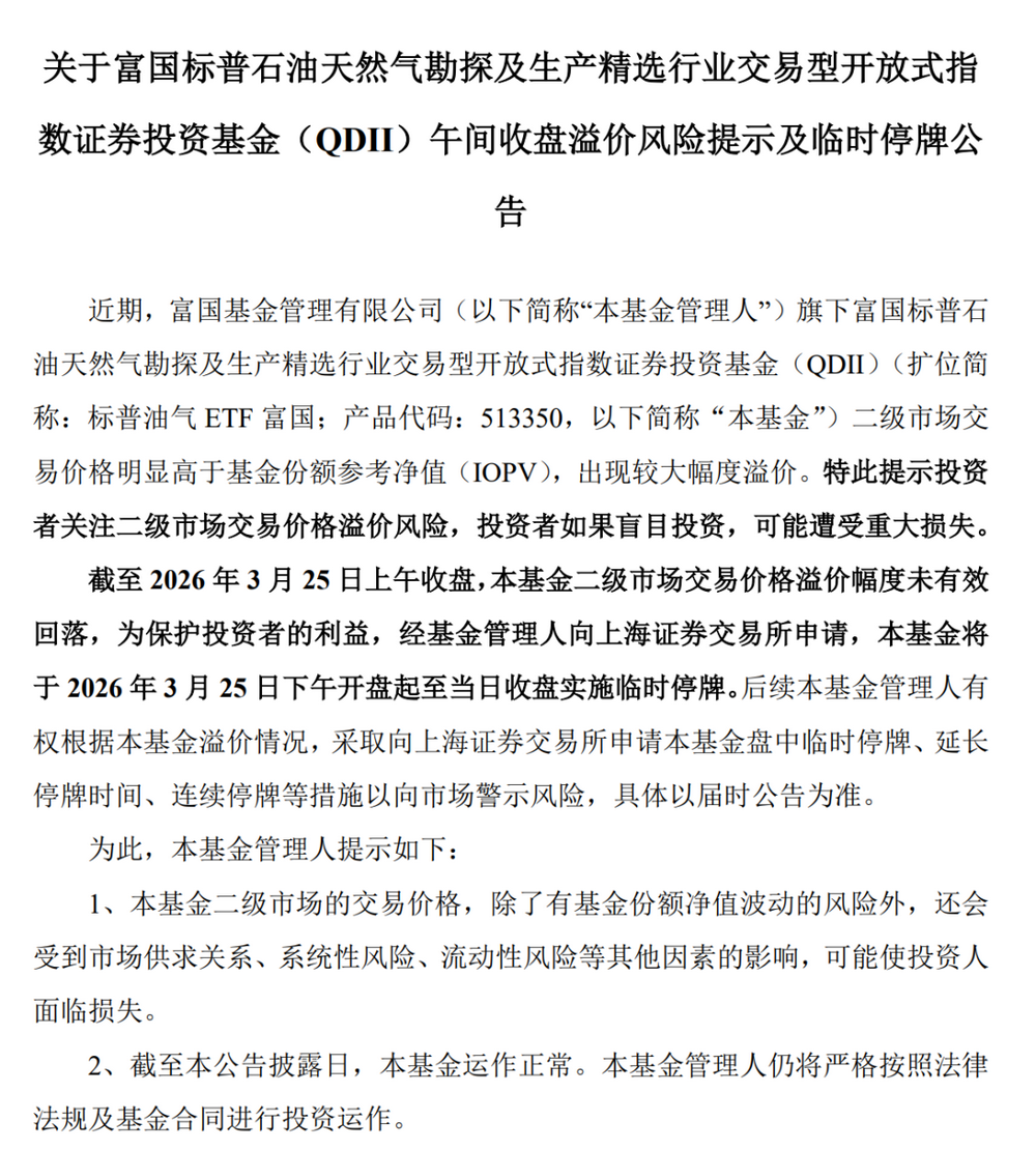3月25日午间收盘,富国基金公告称,由于截至3月25日上午收盘,标普油气ETF富国二级市场交易价格溢价幅度未有效回落,为保护投资者的利益,3月25日下午开盘起至当日收盘实施临时停牌。