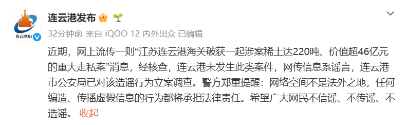 近期,网上流传一则“江苏连云港海关破获一起涉案稀土达220吨、价值超46亿元的重大走私案”消息,经核查,连云港未发生此类案件,网传信息系谣言,连云港市公安局已对该造谣行为立案调查。