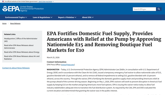 美国环境保护署(EPA)取消了对E15汽油(一种掺混了15%乙醇的燃料)销售的限制,允许炼油厂和零售商在夏季期间销售E15汽油。