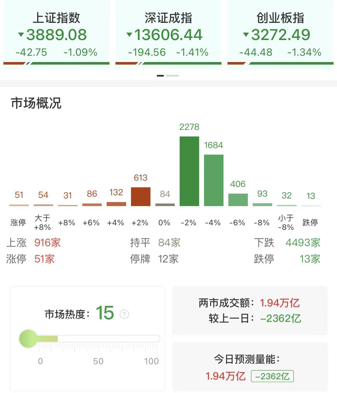 【每日收评】三大指数均跌超1%,全市场超4400股收绿,两市成交额不足2万亿