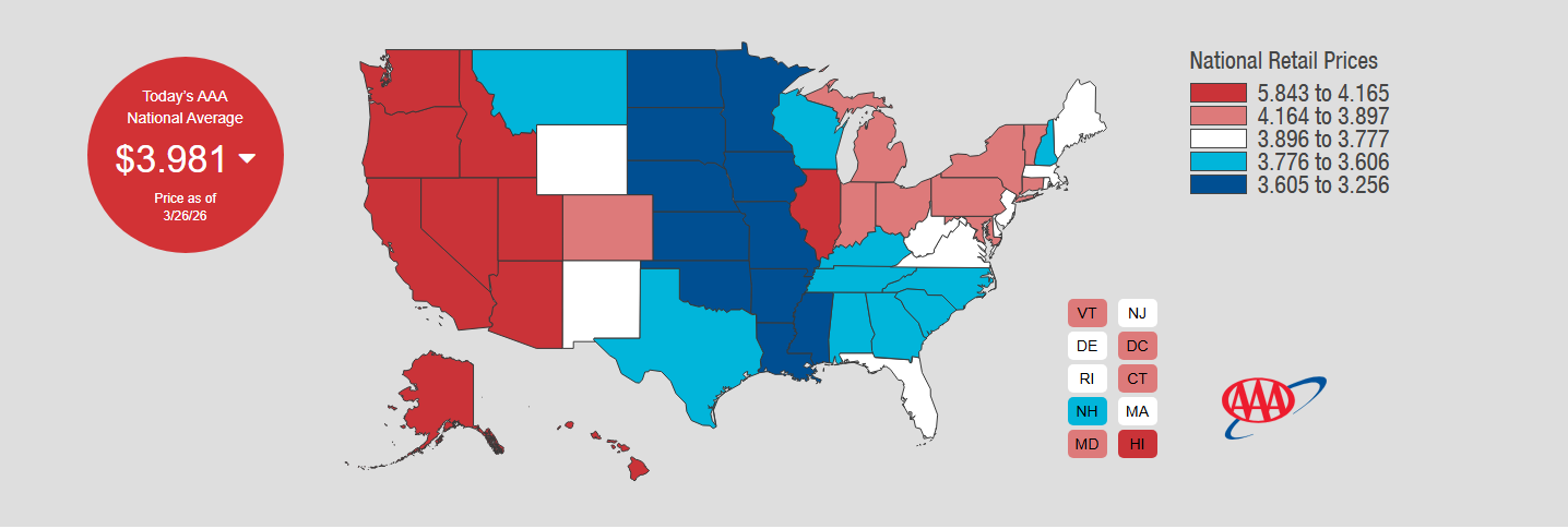 霍尔木兹海峡的中断已经推升了全球油气价格,美国国内的汽油价格也已经水涨船高,加大了美国普通民众的生活成本压力。据美国汽车协会(AAA)数据,截至本周四(3月26日),美国全国汽油均价已经达到3.98美元/加仑,达到2022年以来新高,比伊朗战争爆发前飙升了超30%。