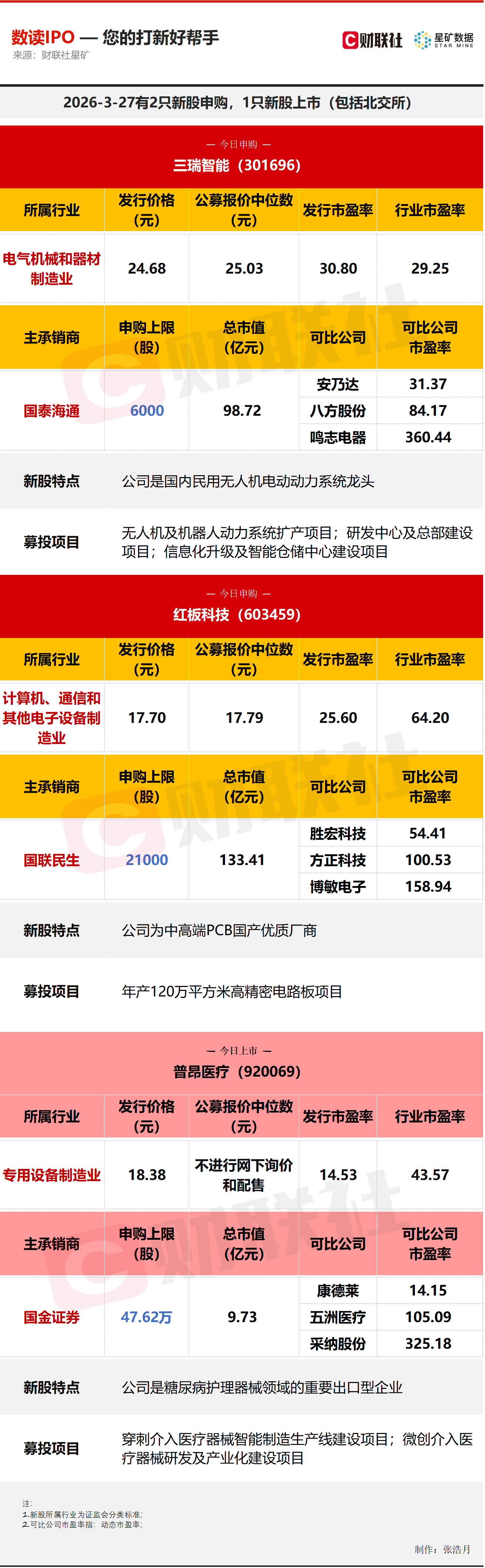 财联社3月27日讯,今日有2只新股申购,分别为创业板的三瑞智能,沪市主板的红板科技;1只新股上市,为北交所的普昂医疗。