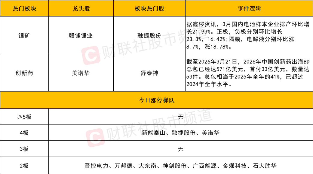 短线情绪再度回暖,今日有三只个股晋级4板,且恰好是目前市场的三大热门方向。其中美诺华走出6天5板进一步打开了医药股的板块高度,万邦德4天3板,双鹭药业3天2板,热景生物、舒泰神等20CM涨停。融捷股份同样带动锂电产业链全线爆发,石大胜华6天3板,赣锋锂业、盛新锂能等人气权重同样涨停。电力股还是以分化为主,新能泰山(4连板)成为板块中新连板高标,而宁波能源斩获4天3板,人气龙头华电辽能、华电能源则全天震荡,但强势上涨结构得以延续,此外豫能控股、中南文化也完成了反包涨停。在存量博弈的环境下,预计资金仍将会围绕着上述方向来回博弈,踏准节奏仍是当下应对的重点。