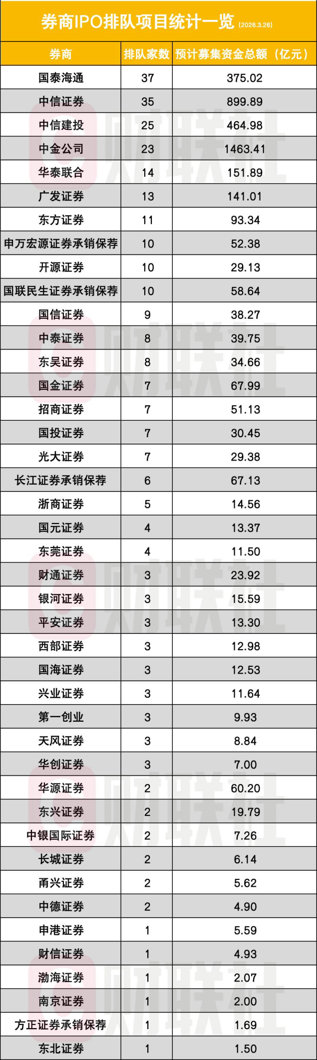上述在审排队企业由42家券商保荐承销,预计募资合计3576.42亿元。保荐承销数量最多的券商是国泰海通,保荐承销37单;中信证券紧随其后,有35单。