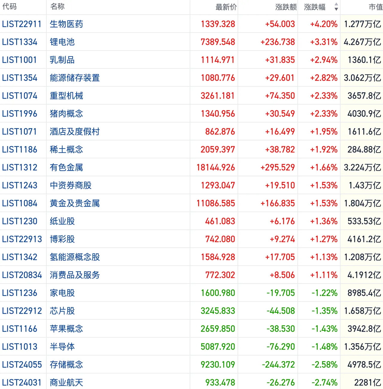 其他方向上,锂电、储能等新能源赛道集体走强,餐饮、乳业、汽车等消费股再度活跃。此外,黄金、券商、煤炭等板块延续热度。