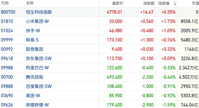 盘面上,今日大型科网股涨跌不一,小米涨近2%,快手、网易小幅上涨,美团、百度、腾讯飘绿。