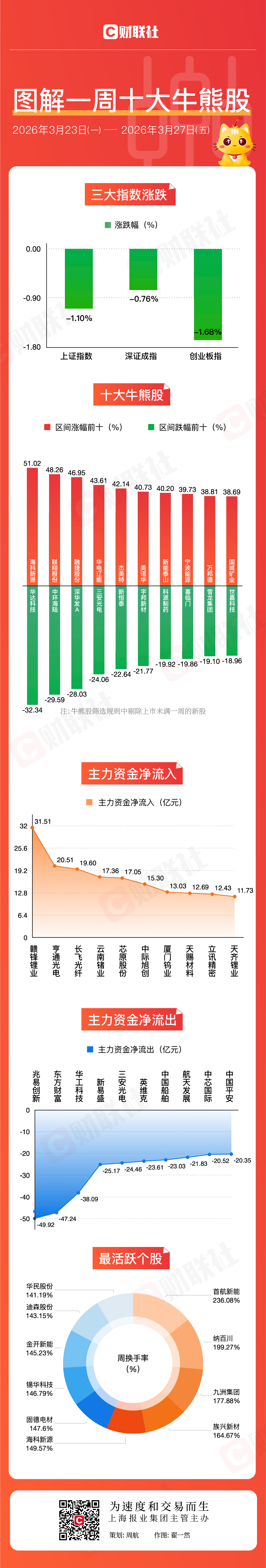 财联社3月28日讯,本周A股三大指数震荡回调,其中上证指数周跌1.10%,深成指周跌0.76%,创业板指周跌1.68%。本周绿色电力、电池板块涨幅居前,能源金属、兵装重组概念股表现活跃。