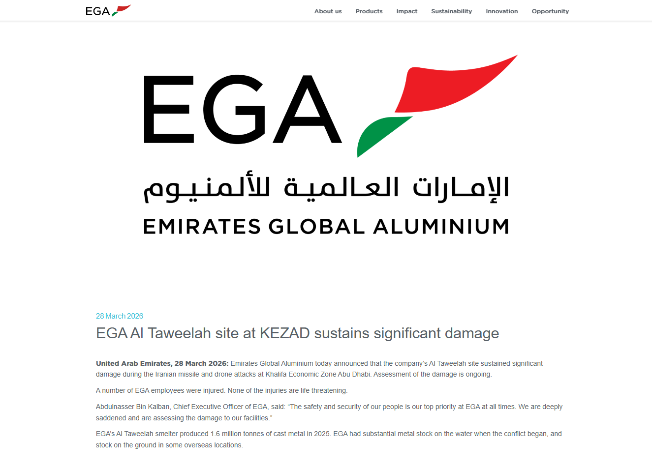 公司官网显示,全球每生产25吨铝,就有1吨来自阿联酋环球铝业。这相当于全球4%的产能。