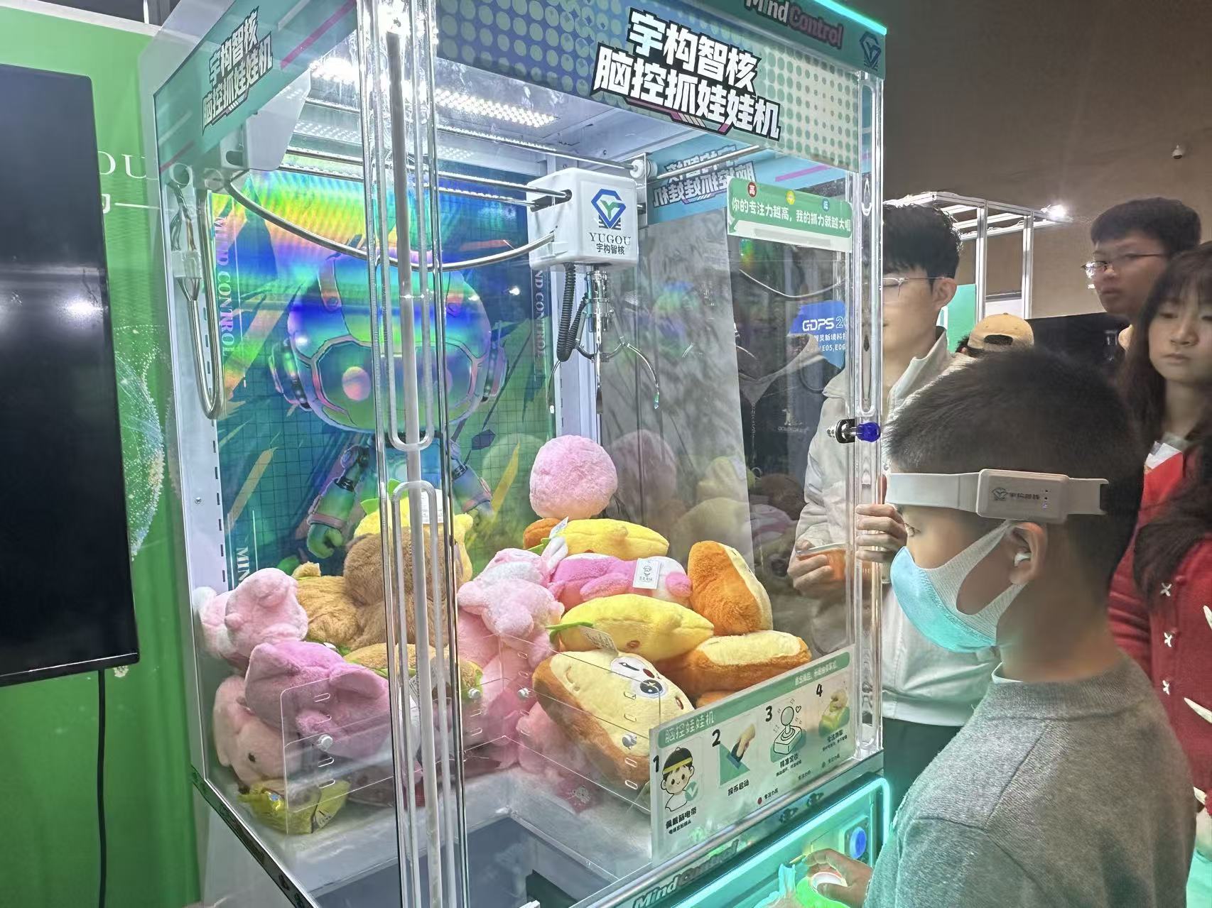 宇构智核展示脑机接口应用产品,可以脑控抓娃娃、脑控制作爆米花等。现场工作人员介绍,带上脑机接口相关设备后,只要提升专注力,设备就会捕捉脑电波的信号,启动娃娃机、棉花糖机器等。