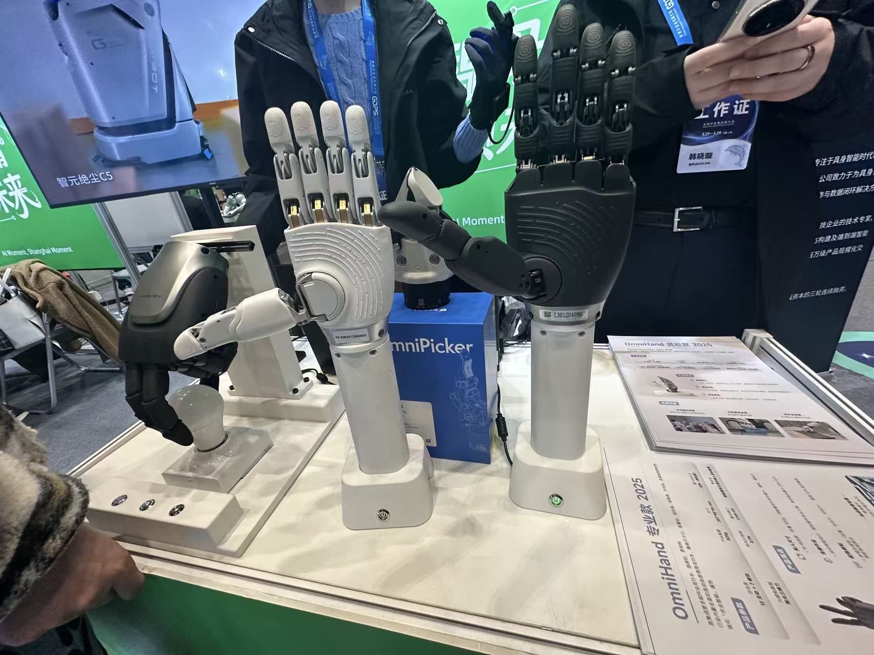 智元机器人旗下灵巧手公司临界点也展示了最新产品。其中OmniHand 专业款 2025是高集成度全能作业灵巧手,实现“12个主动自由度+7个被动自由度”,产品重量820g。OmniHand 灵动款 2025是行业内唯一一款小尺寸高自由度商用灵巧手,适用于各种尺寸人形机器人,实现“10个主动自由度+6个被动自由度自由度”,产品重量510g。
