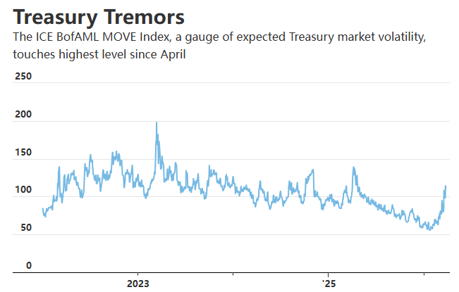 此次跨市场的剧烈波动,发生在一种绝非寻常的背景下。衡量美国国债预期波动率的指标——美银MOVE指数近期已飙升至去年4月以来的最高水平——当时美债市场的动荡曾迫使美国总统特朗普紧急推后了其“解放日”关税措施。