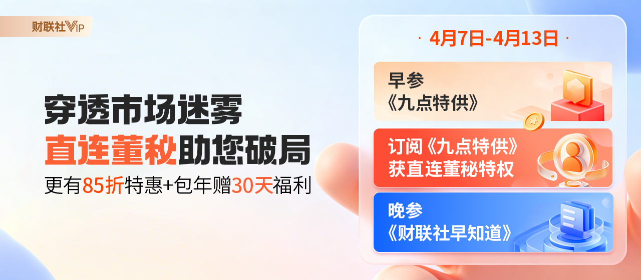 当下,财联社VIP专属晨晚间两大栏目——晨间《九点特供》与晚间《财联社早知道》,限时推出重磅福利活动!订阅《九点特供》即可解锁直连董秘专属特权,让您轻松获悉上市企业核心信息,告别信息差,直击公司价值与风险。此外,即日起至4月13日,两款栏目送上85折超值优惠,订阅最高直降748元,包年加赠30天服务时长,助力投资者更好复盘当日行情、前瞻市场热点。活动具体详情一起来看: