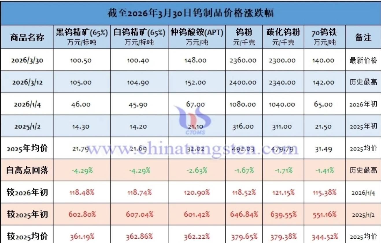 全球钨原料价格持续攀升,截至2026年3月30日,碳化钨粉价格达2300元/kg,较2025年均价上涨379.38%,较2025年初上涨639.55%。