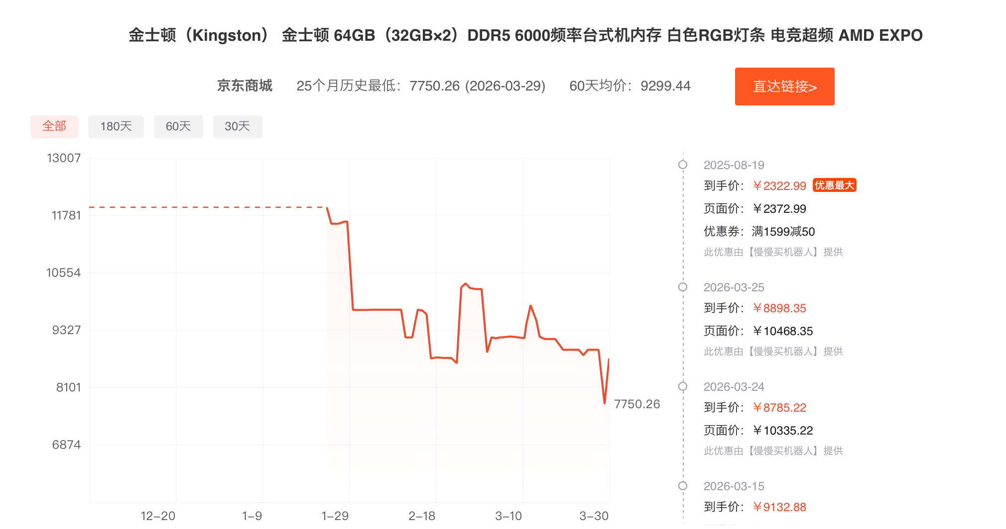 根据慢慢买App,京东商城的一款金士顿64GB(32GB×2)DDR5 6000频率台式机内存目前售价为7750.26元,而在两个月前,这款产品的价格为11781元。