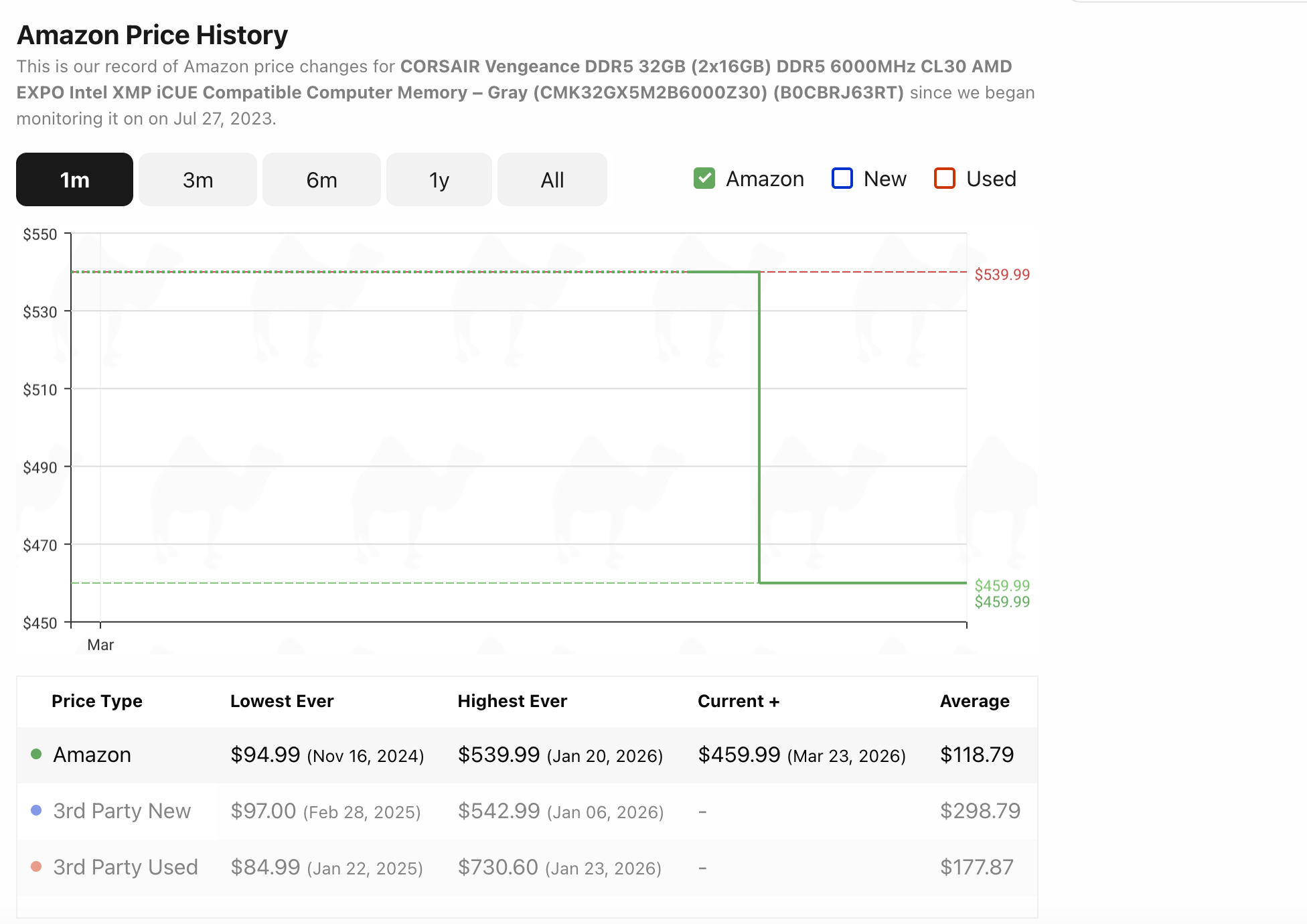 财联社记者于camelcamelcamel平台查询美国亚马逊网站上一款海盗船的复仇者(VENGEANCE)系列DDR5 32GB内存条的价格发现,该产品在一周前从539.99美元降价80美元至459.99美元。
