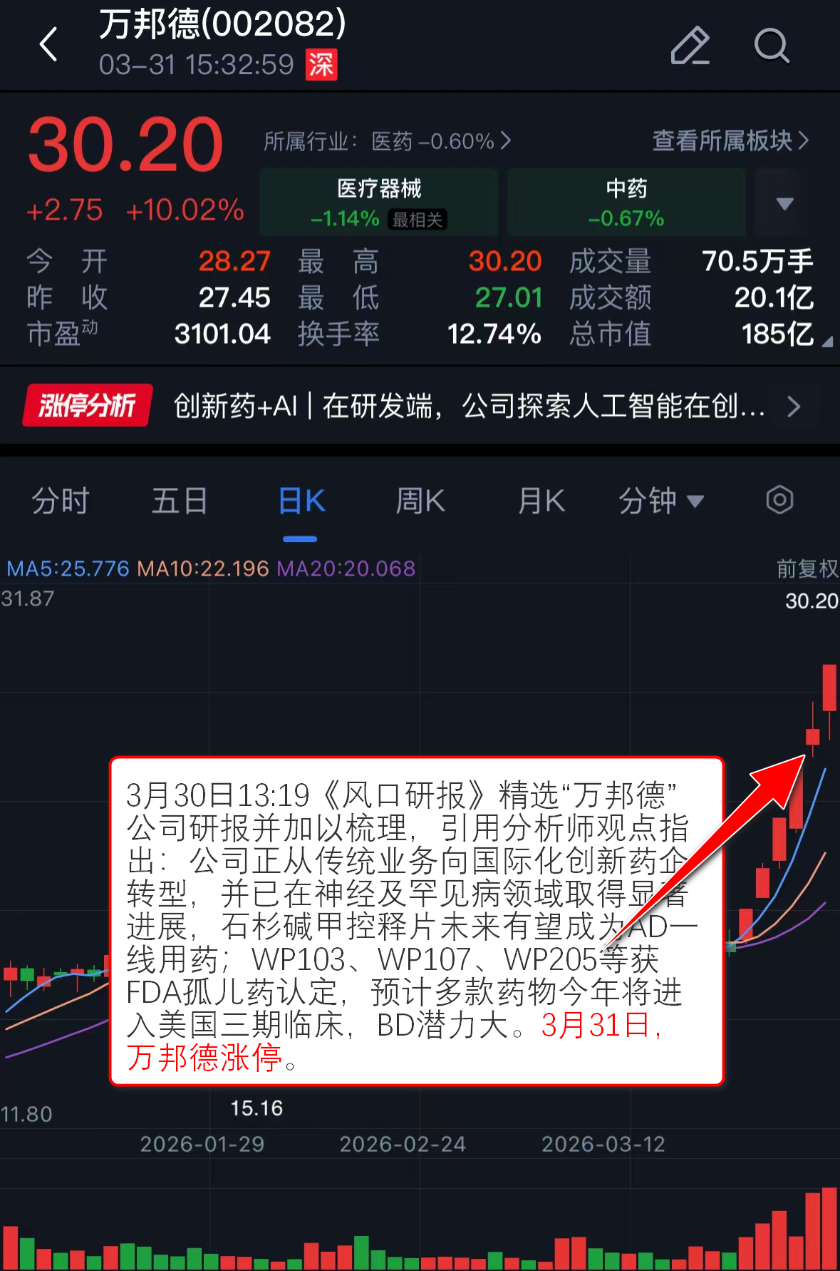 往期回顾:3月30日13:19《风口研报》精选“万邦德”公司研报并加以梳理,引用分析师观点指出:公司正从传统业务向国际化创新药企转型,并已在神经及罕见病领域取得显著进展,石杉碱甲控释片未来有望成为AD一线用药;WP103、WP107、WP205等获FDA孤儿药认定,预计多款药物今年将进入美国三期临床,BD潜力大。3月31日,万邦德涨停。