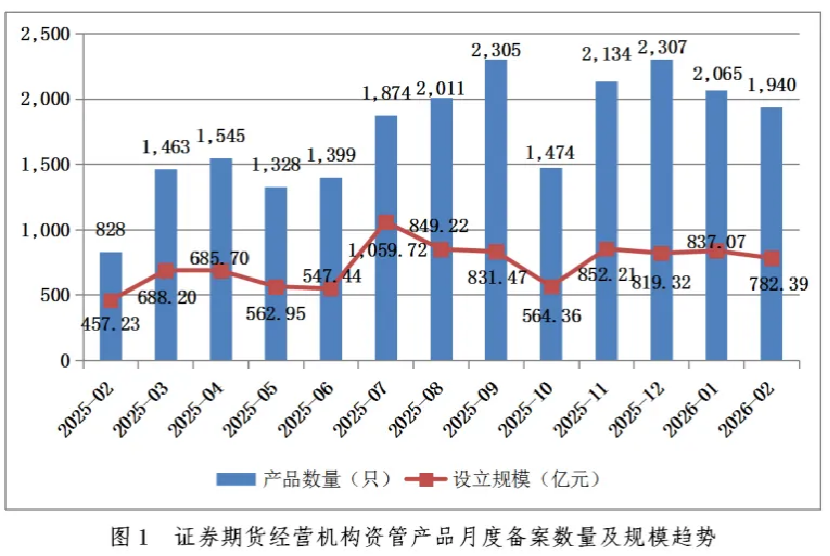 今年2月,证券期货经营机构共备案私募资管产品1940只,环比减少6.05%,同比增加134.30%;设立规模782.39亿元,环比减少6.53%,同比增加71.12%。今年1月,私募资管产品备案2065只,设立规模837.07亿元。