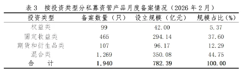 从投资类型看,2月备案的混合类产品数量最多,设立规模最大。