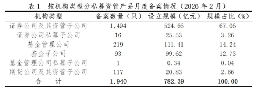 月度备案数据显示,证券公司及资管子公司、基金管理公司、期货公司及资管子公司、基金子公司、证券公司私募子公司、基金管理公司私募子公司,今年2月分别备案了1494只、219只、117只、93只、16只、1只。
