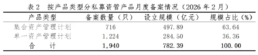 据中基协披露,集合资管计划、单一资管计划今年2月分别备案716只、1224只,设立规模分别为497.89亿元、284.5亿元,规模占比分别为63.64%、36.36%。