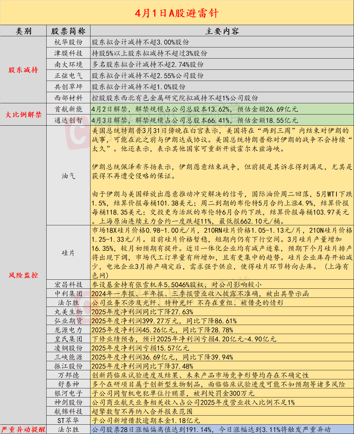 导读:财联社4月1日投资避雷针,近日A股及海外市场潜在风险事件如下。国内经济信息方面包括:1)武汉交警通报“多辆萝卜快跑行驶中突然停车”,初判系统故障;2)硅片价格近期稳中看弱,预期下个月硅片排产将出现下调;公司方面重点关注包括:1)20CM两连板宏昌科技公告,参设基金持有张雪机车5.5046%股权,对公司影响较小;2)中利集团2024年一季报、半年报、三季报营业收入披露不准确,被出具警示函;海外市场重点关注包括:1)伊朗与美国释放出愿意推动冲突解决的信号,国际油价周二回落;2)沃伦·巴菲特表示,股票市场估值仍然缺乏吸引力。