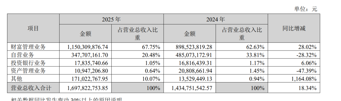 从业务结构来看,财富管理业务无疑是华林证券2025年的核心增长引擎。报告期内,该板块实现营业收入11.5亿元,同比增长28.02%,占营业总收入比重高达67.75%,主力地位进一步巩固,营业利润率提升至51.69%。
